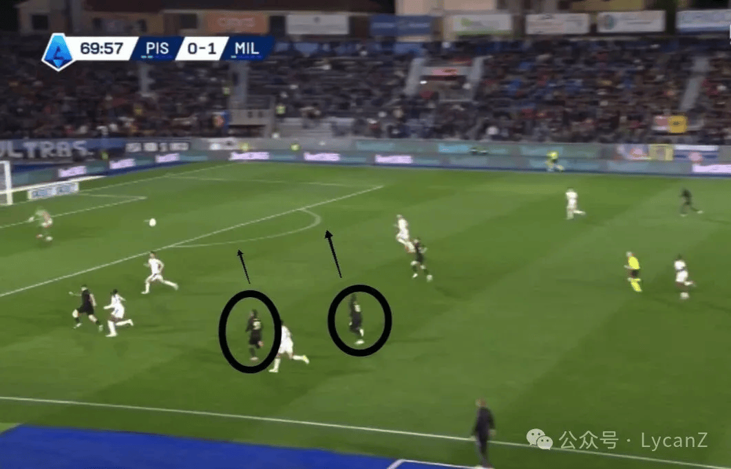米兰的进攻模式还是相对固定的:锋线回撤做轴,中场前插吸引防守创造空间,边路接应传球后,或者自己直接传中,或者联动前插的队友制造传中机会。
